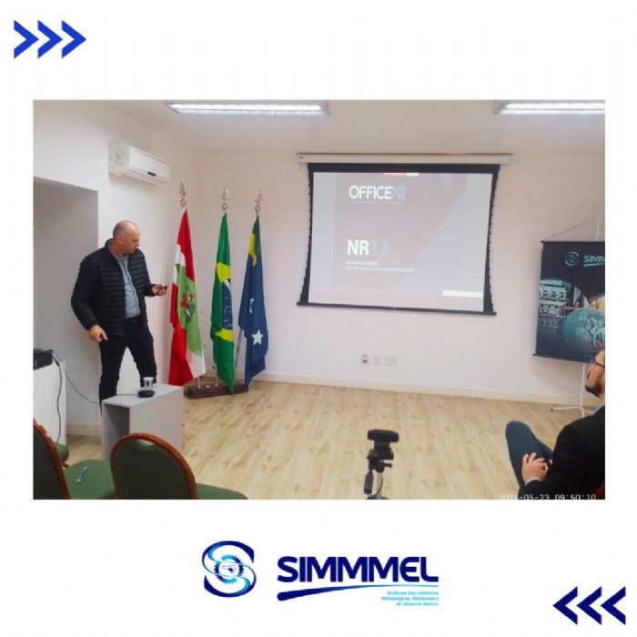Maykell Kreissig da empresa NR Office, apresentou a empresa que possui consultores especialistas em NR 12. Nosso time conta com um grupo de engenheiros mecânicos, de segurança do trabalho e eletricistas visando atender à necessidade das empresas na adequação da NR 12.